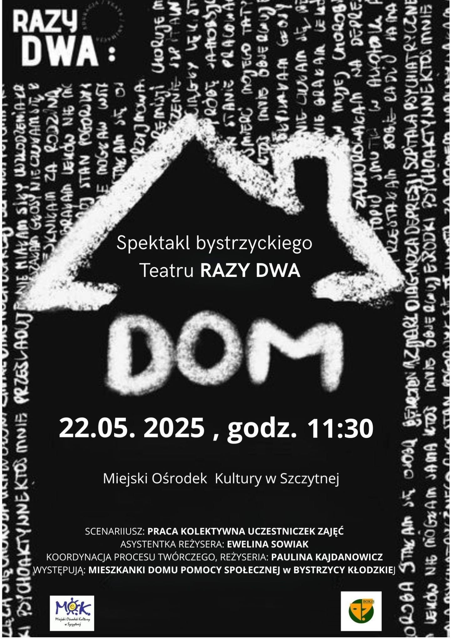 „DOM” to niespotykany spektakl, który napisało życie. Na scenie zaprezentują się niezwykłe Kobiety – mieszkanki Domu Pomocy Społecznej w Bystrzycy Kłodzkiej, które podczas 9-cio miesięcznego procesu pracy i zajęć teatralnych stworzyły historię chwytającą za serca. Pokonały lęki, obawy, a także zyskały odwagę, aby opowiedzieć swoje historie – niezwykle przejmujące i wzruszające: o swojej chorobie i życiu.Jest to spektakl pełny nadziei i kolorowych barw, ukazujący że warto być zawsze sobą i dostrzegać piękno życia.
