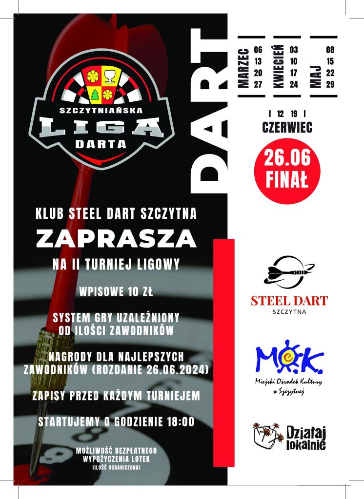 STEEL Dart Szczytna zaprasza wszystkich chętnych na II rundę Szczytniańskiej Ligi Darta, która rusza 06.03.2024 r w MOK Szczytna o godzinie 18:00. Przed nami 15 spotkań, które zakończą się Wielkim Finałem w dniu 26.06.2024 r. Gwarantujemy wielkie emocje , adrenalinę oraz dużo zabawy w miłej atmosferze.