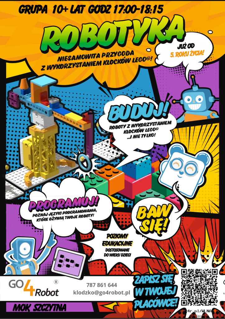Zapraszamy wszystkie chętne dzieci w wieku 10+ do zapisów na zajęcia z lego robotyki. Zapisy za pomocą kodu QR lub na stronie https://g4r.pl/WLNAR.